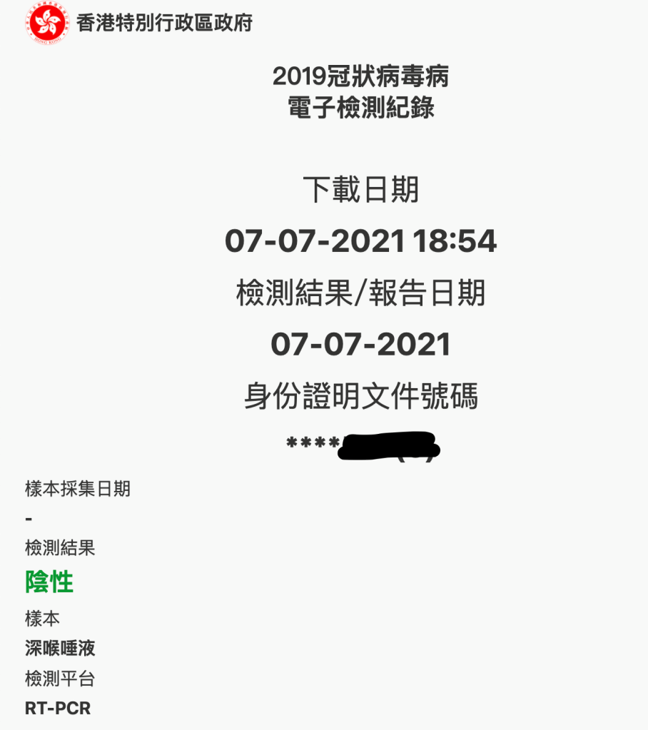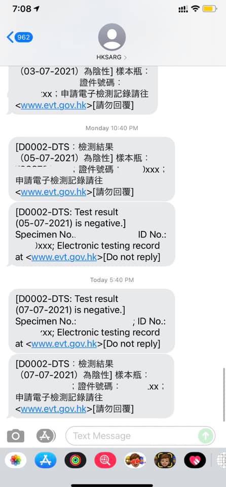 一兩天後,你會收到HKSARG的短訊,包括日期、檢測結果、樣本瓶編號、證件號碼(身份證頭4位)