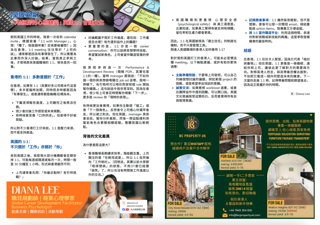 在香港,1:1 往往令人緊張,因為它代表「檢討與審視」;但在英國,1:1 更像是一條橋樑,連結你和上司,讓彼此更了解對方的需要與方向。對移英港人而言,與其帶着恐懼去面對,不如把它看成一個共同塑造未來的機會。下一次當你走進 1:1 時,記得帶着問題和期望進去,因為這正是屬於你的時間。